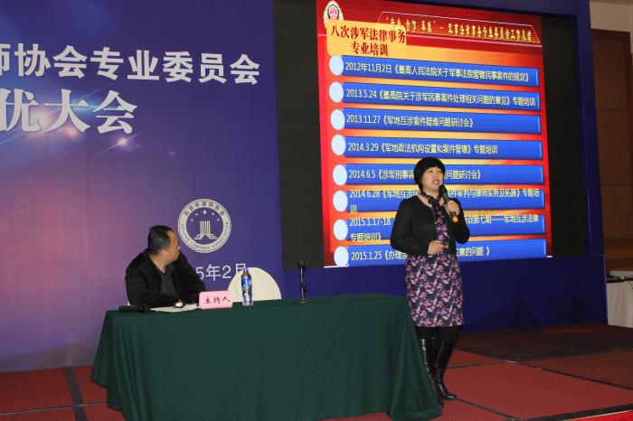 会上,我所主任武丽君律师以《专业 合作 奉献》为主题,用精练的语言对其担任军事法律专业委员会主任3年来开展的各项工作进行了精确总结,全方位介绍了军法委开展的各项工作。大量的图片和照片,丰富了动漫立体的PPT画面,向大家直观展示各项活动,获得了北京市律协参会领导和律师们的高度评价。