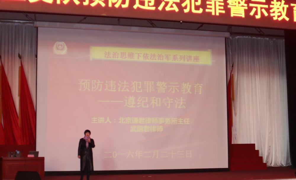 2016年2月23日,正月十六,北京武警某支队积极响应依法治军号召,邀请北京谦君律师事务所主任、北京市律协军事法律事务专业委员会主任武丽君律师,带领谦君律师团队,为该支队官兵开展法治教育,为官兵更出色地完成两会执勤安保任务,提供法律支持和帮助。