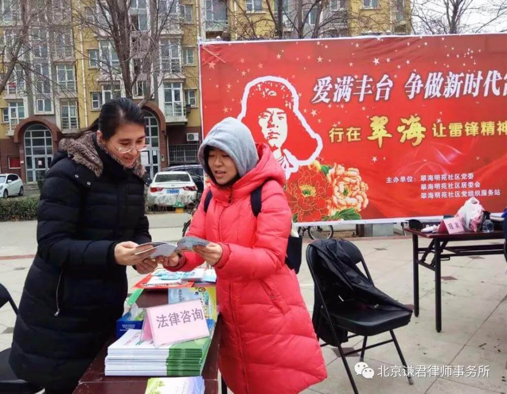 新春伊始,万象更新。近日,丰台区“爱满丰台 争做新时代雷锋”活动在全区拉开了帷幕。北京谦君律师事务所选派吴彦明、张俊勇、朱嫄嫄、任媛等一行律师,积极参加了丰台区南苑街道翠海社区、王佐镇南宫雅苑社区组织的“爱满丰台 争做新时代雷锋”和“弘扬雷锋精神,倡导时代新风”志愿学雷锋活动。