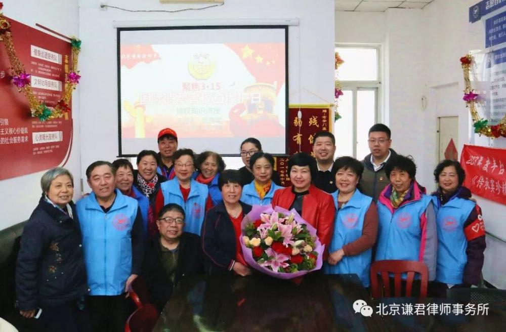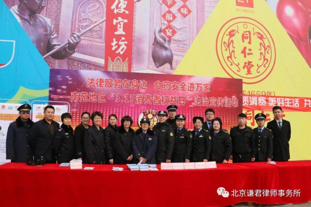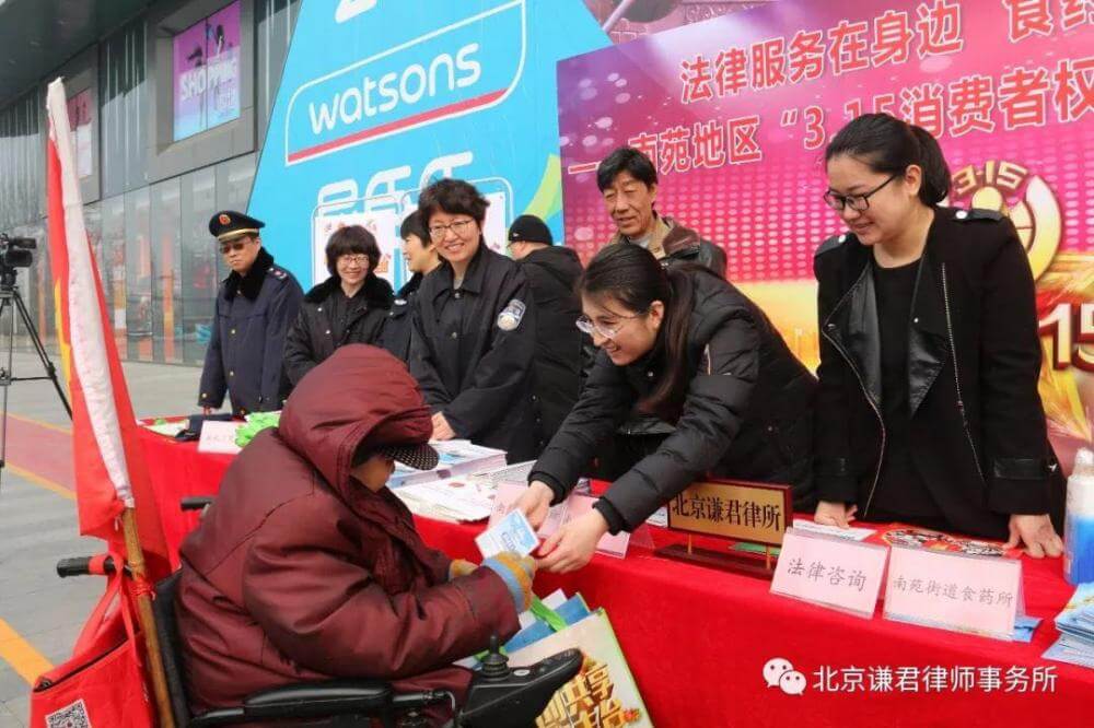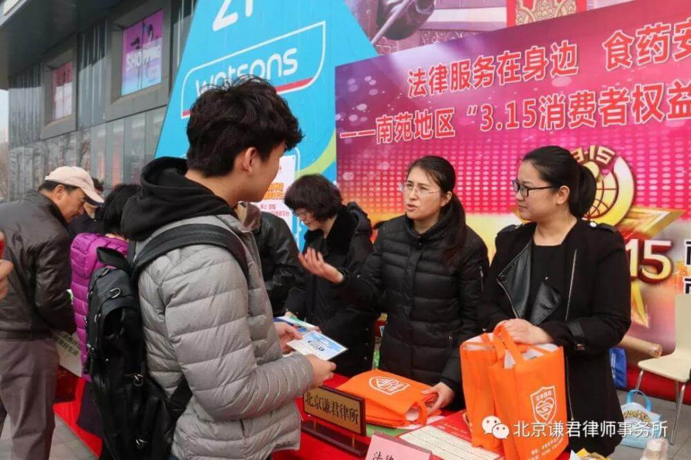 3月14、15日,北京谦君律师事务所武丽君主任、吴彦明律师等一行6人,分别参加了由南苑街道司法所会同南苑乡司法所联合在槐房万达广场组织开展的“法律服务在身边,食药安全进万家---南苑地区‘3.15’消费者权益日”法治宣传活动和右安门街道司法所在窦珍志愿者协会组织开展的“聚焦‘3.15’国际消费权益保护日知识讲座”普法培训活动。