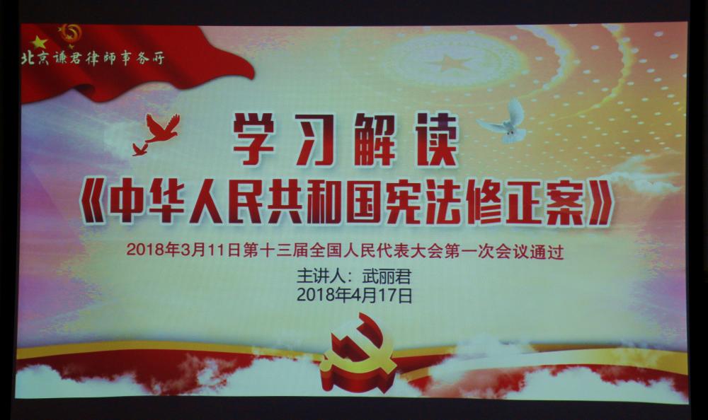 4月17日,北京谦君律师事务所武丽君主任一行受窦珍志愿者联合会的邀请,为窦志联骨干队长们开展了“学习贯彻《中华人民共和国宪法修正案》”讲座。右安门街道司法所刘宏智所长和窦志联芦婉华会长参加了培训讲座。