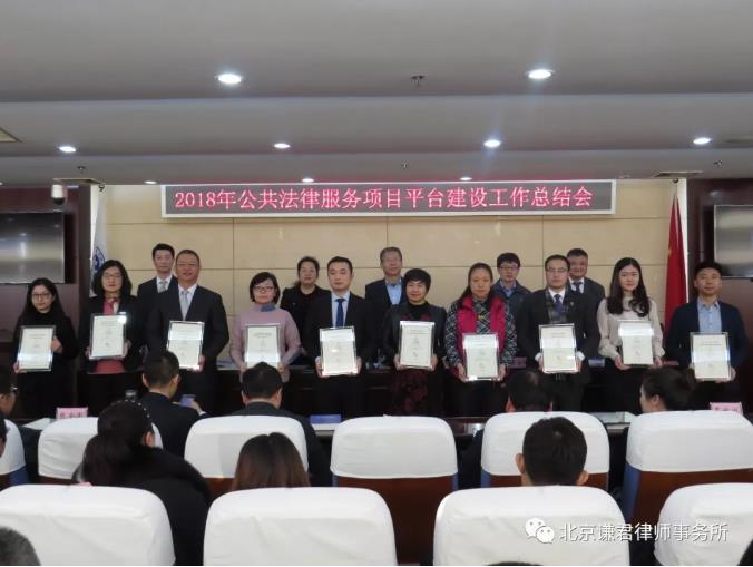 2019年1月9日,北京谦君律师事务所武丽君主任作为北京市律师行业优秀代表,应邀出席北京市律师协会召开的2018年公共法律服务项目平台建设工作总结会。谦君律所精心打造的《军人法律知识培训及法律服务》、《残疾人及残疾人工作者法律与政策宣传》入选北京市公共法律服务项目(产品)目录。会上武丽君主任代表谦君所上台领取了北京市司法局、北京市律协颁发的项目证书。
