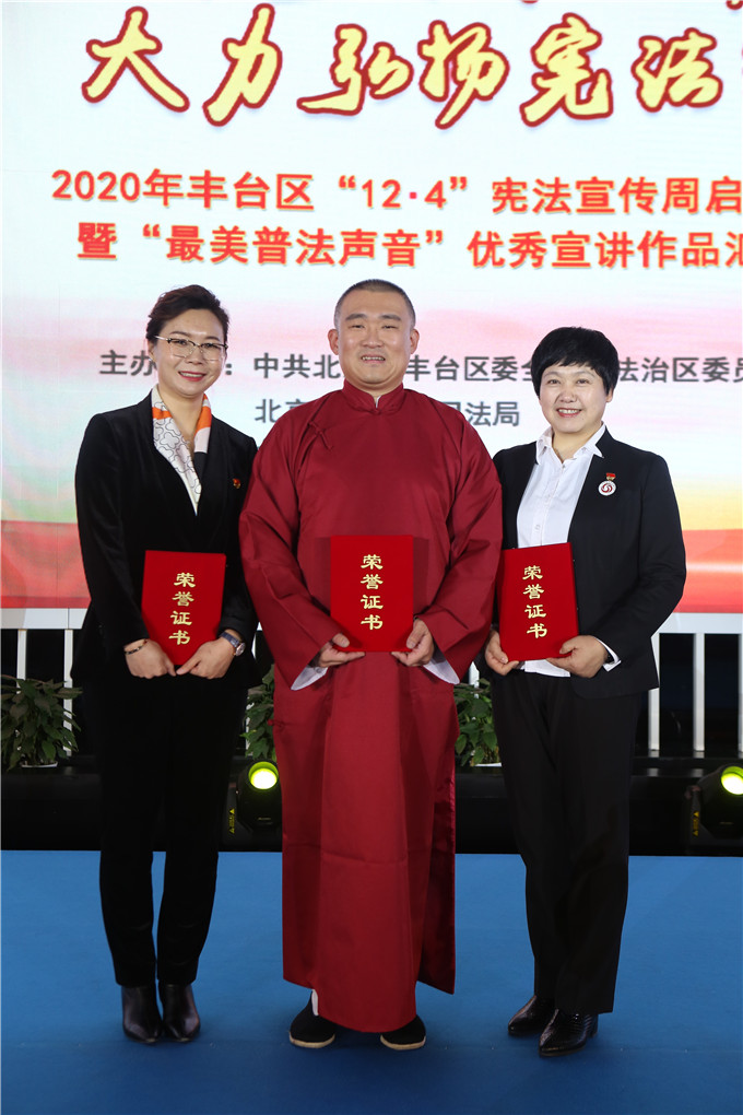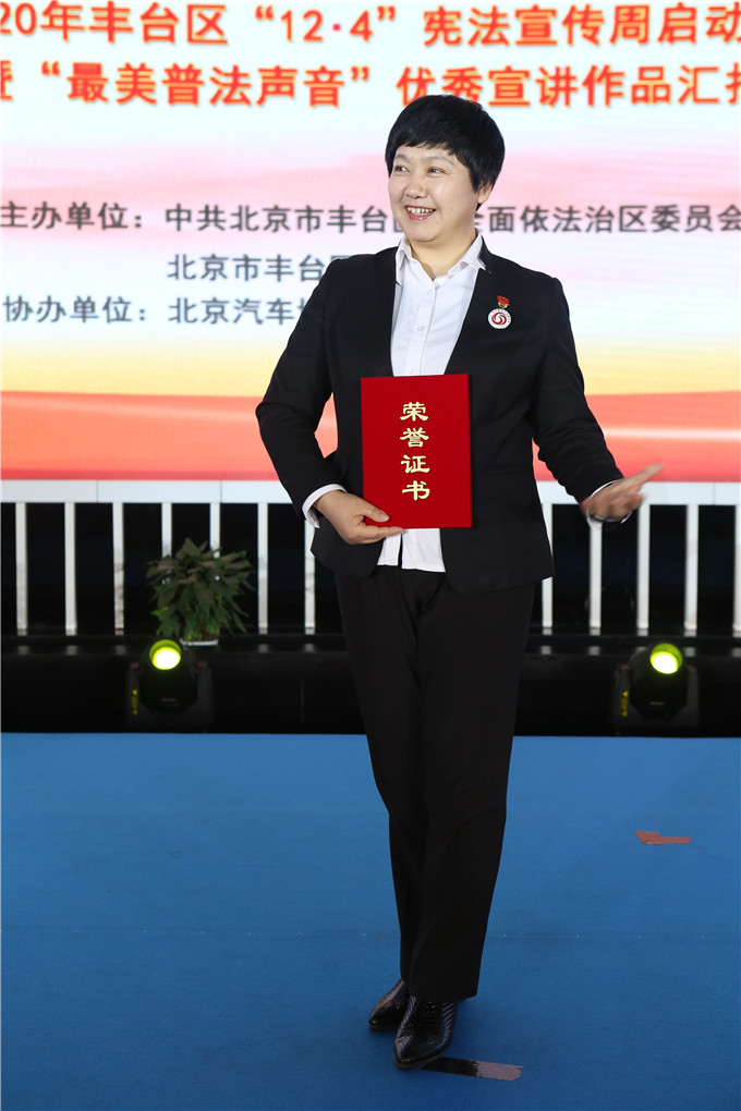 武主任及谦君律师助力丰台区“最美普法声音”取得了社会广泛的肯定和赞誉。据了解,“最美普法声音”主题普法活动由丰台区委全面依法治区委员会守法普法协调小组、区司法局主办,共收到报送作品70余部,经过初赛专家评比,最终入围20部优秀宣讲作品。 一份耕耘,一份收获。在11月30日,丰台区“12.4”宪法宣传周启动仪式暨“最美普法声音”优秀宣讲作品汇报会上,武主任获“优秀作品奖”。