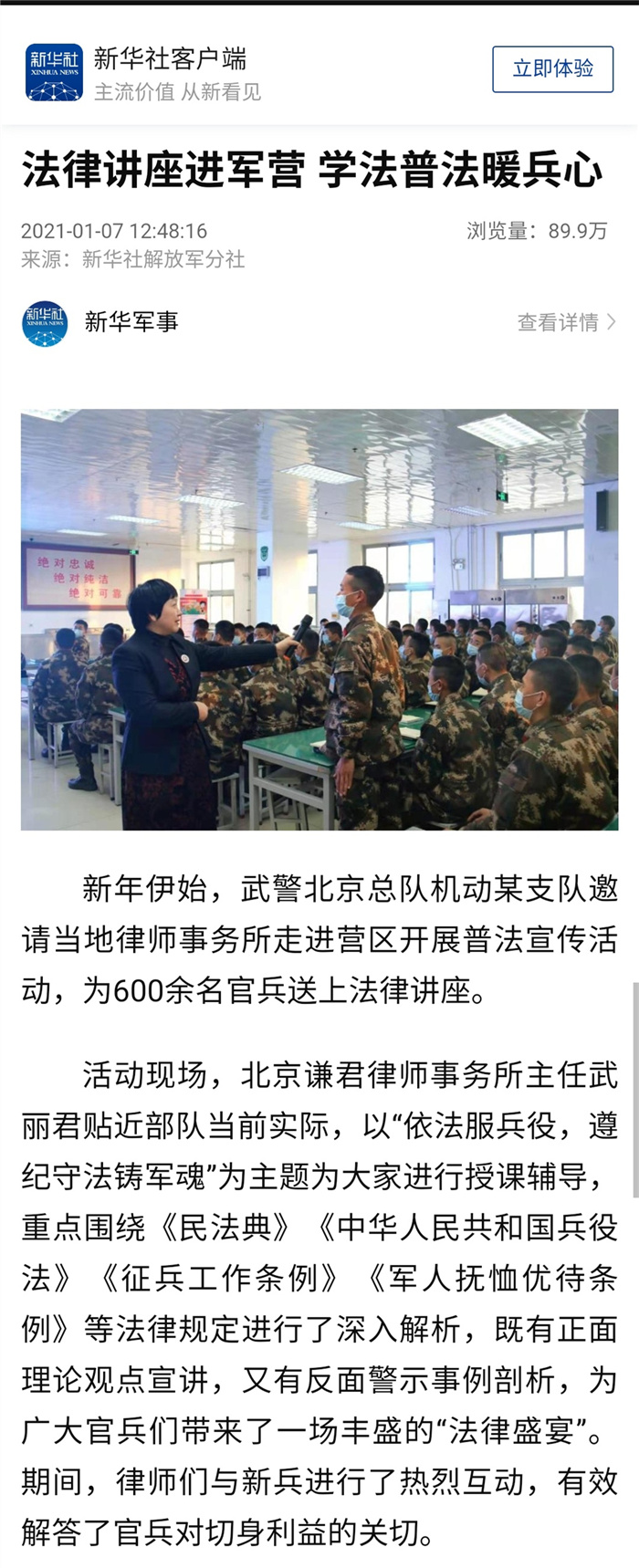 新华社解放军分社刊登武丽君主任送法进军营文章!
