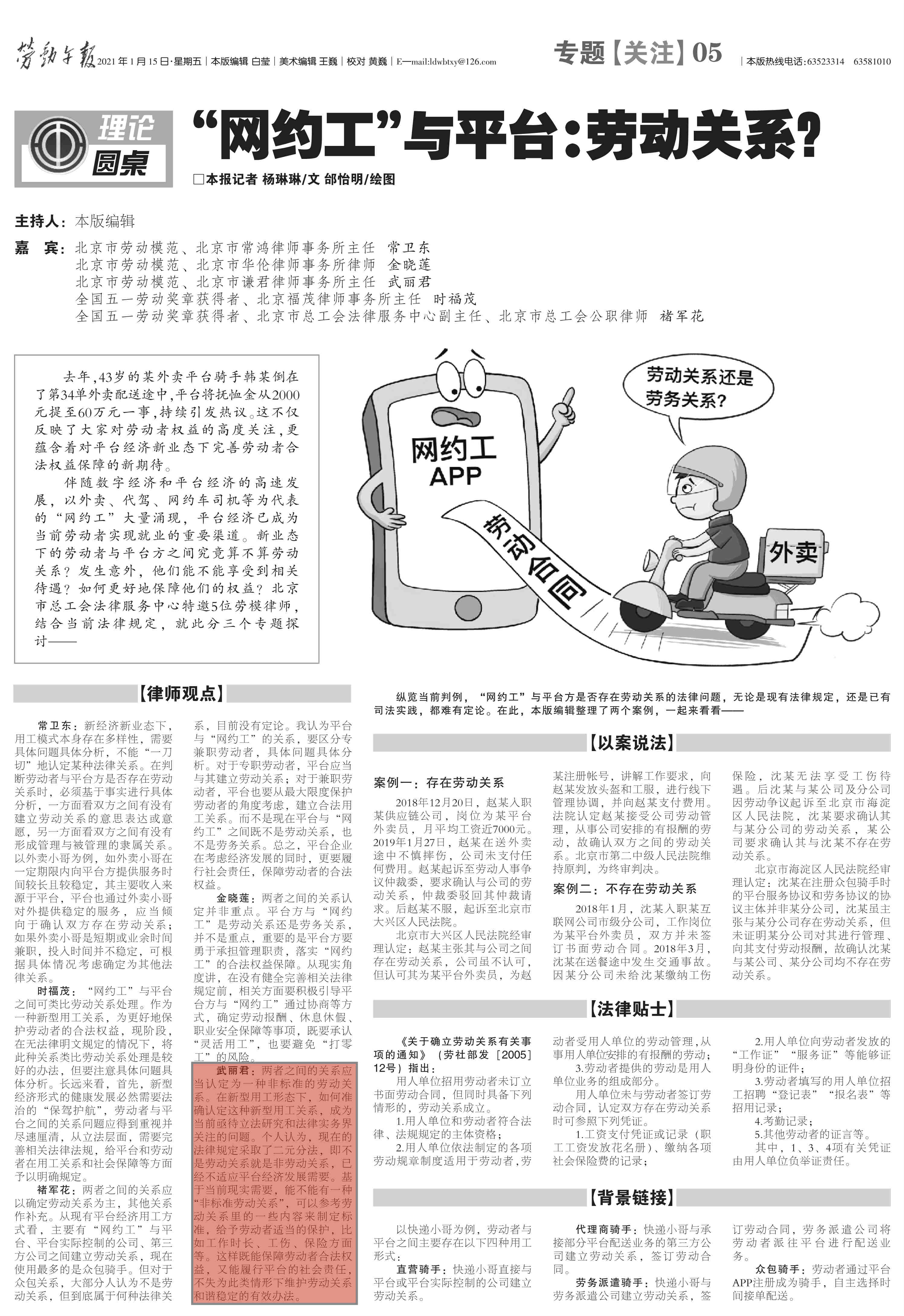 武丽君主任应劳动午报邀请,就“‘网约工’与平台:劳动关系?”热点话题进行研讨,并发表观点!