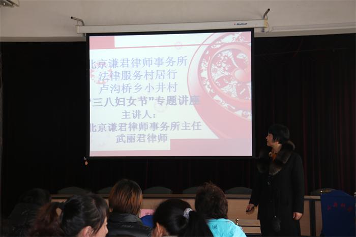 2015年3月5日,春风送暖,辞旧迎新,新春佳节恰逢国际“三八”妇女节,北京谦君律师事务所武丽君主任应卢沟桥乡司法所、小井村村委会邀请,为小井村女性朋友带来法治思维下系列讲座之《妇女维权法律知识篇》。