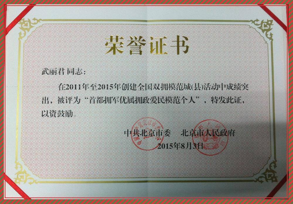 2015年9月8日,继8月28日所庆之后,北京谦君律师事务所又迎来了一个喜庆的日子,武丽君主任被评为“首都拥军优属拥政爱民模范个人”,成为首都第一个获此殊荣的律师,这是对她八年如一日为部队默默付出的肯定。