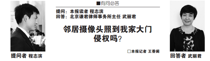 程志滨:我是北京一居民小区三层的住户,也是《劳动午报》的忠实读者。在我们单元,每层有两户业主。前些日子,我们小区发生了几起入户偷盗事件,我家对门的邻居前后阳台都安装了护栏,小偷从大门入室偷走了一些钱财。邻居为了避免再次被偷,就在门外的墙上安装了监控摄像头。我家在东侧,旁边就是从二层上到三层的楼梯,而邻居安的摄像头不仅照着他自家的门,还照着我家门及上来的楼梯。我们全家人出入都在邻居的监控之下,感觉很不舒服,就找他们谈过一次,希望能把摄像头的角度调换一下。可对方说这是卖摄像头的人来给安装的,人家再上门重新安装需要收300元上门费,除非这笔钱我家出,不然他们也没办法。请问:我现在该怎么办?邻居家的摄像头照到我家大门,侵权吗?