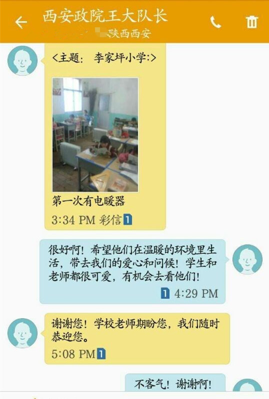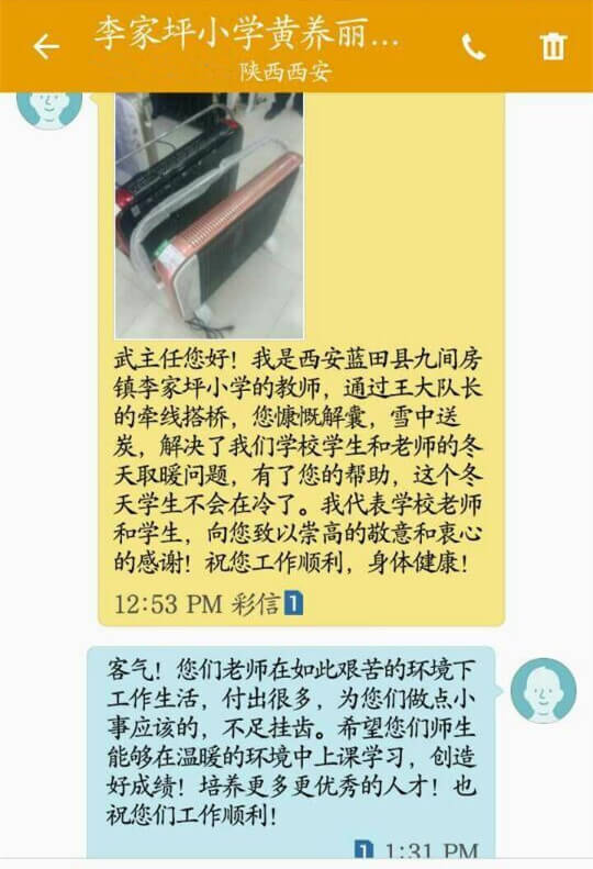 北京谦君律师事务所武丽君主任得知李家坪小学的师生们每每到了冬天都是在寒冷刺骨的教室里上课的消息后,心系贫困山区小学师生们的疾苦,经西安政院领导牵线搭桥,慷慨解囊,为该小学每间教室里均购买配置了取暖用的电暖气和棉门帘,并交付了今冬取暖设施所用的全部电费。