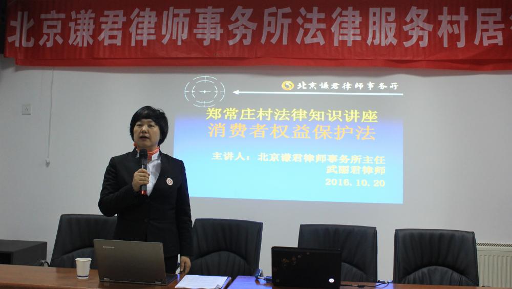 2016年10月20日,在丰台区卢沟桥司法所的支持下,谦君律所主任武丽君律师在百忙之中为卢沟桥乡郑常庄村村民带来了精彩法律讲座。继上次“讲解民事案例、处理民事纠纷”讲座之后,本次讲座的主题是和村民日常生活息息相关的消费者权益保护,村民们感到受益匪浅,不时报以热烈掌声。