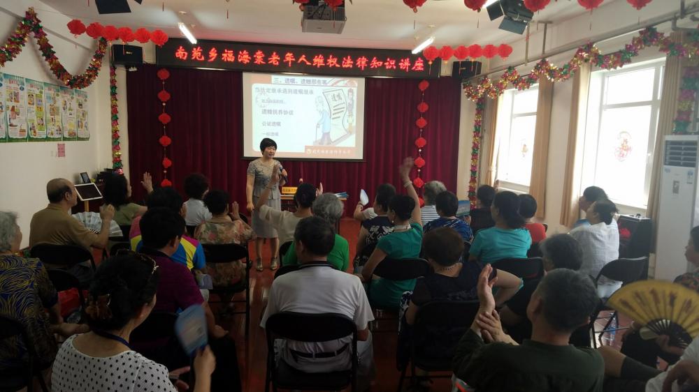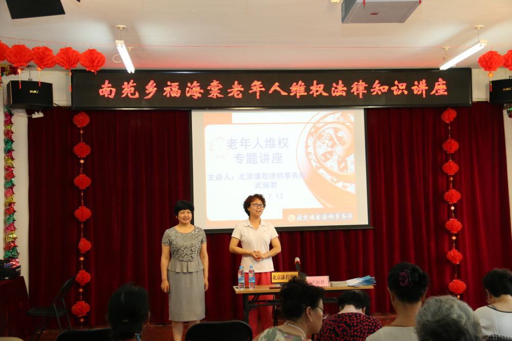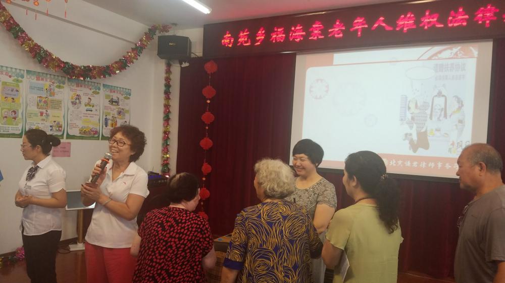 北京谦君律师事务所认真履行社会责任,积极开展法律服务村居行活动,老年人维权法律知识讲座是谦君律所婚姻家庭系列讲座的一部分,谦君律所公益普法宣传活动,已经开展到南苑乡、卢沟桥乡和长辛店镇等二十余家社区和农村,讲座数十场,发放普法凉扇和便民联系卡千余份,受到司法所和村居民的普遍欢迎和一致好评!