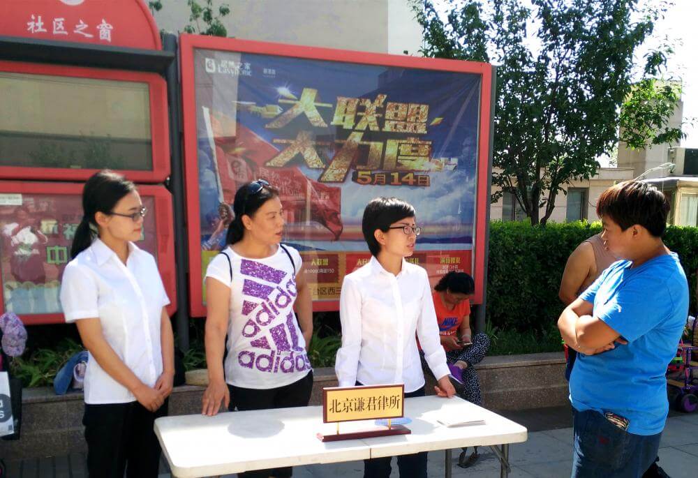 2017年6月9日、10日,北京市丰台区司法局组织人员,认真贯彻落实第七届北京市司法行政开放日---“司法行政在身边”活动内容,在丰台区及各街、乡开展了形式多样的法治宣传活动。北京谦君律师事务所武丽君主任率领谦君团队,配合司法局奔赴丰台区街头、村(居)和公园等地,积极参与了此次普法宣传活动。