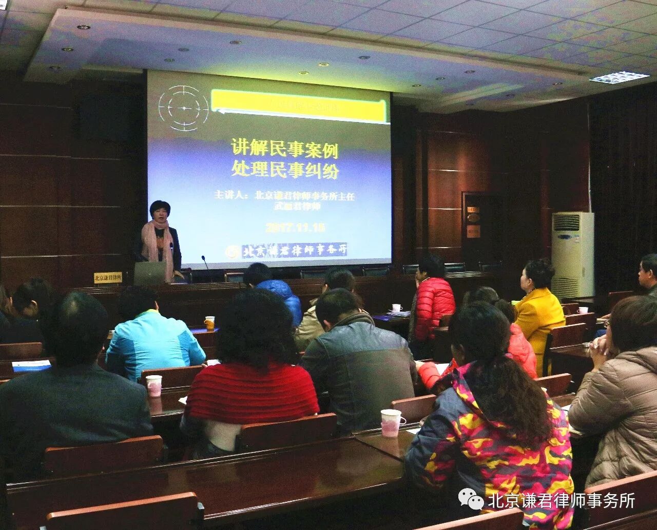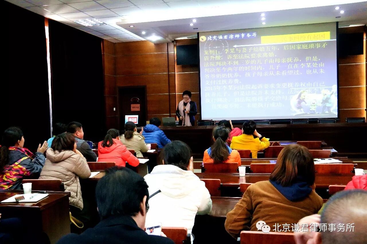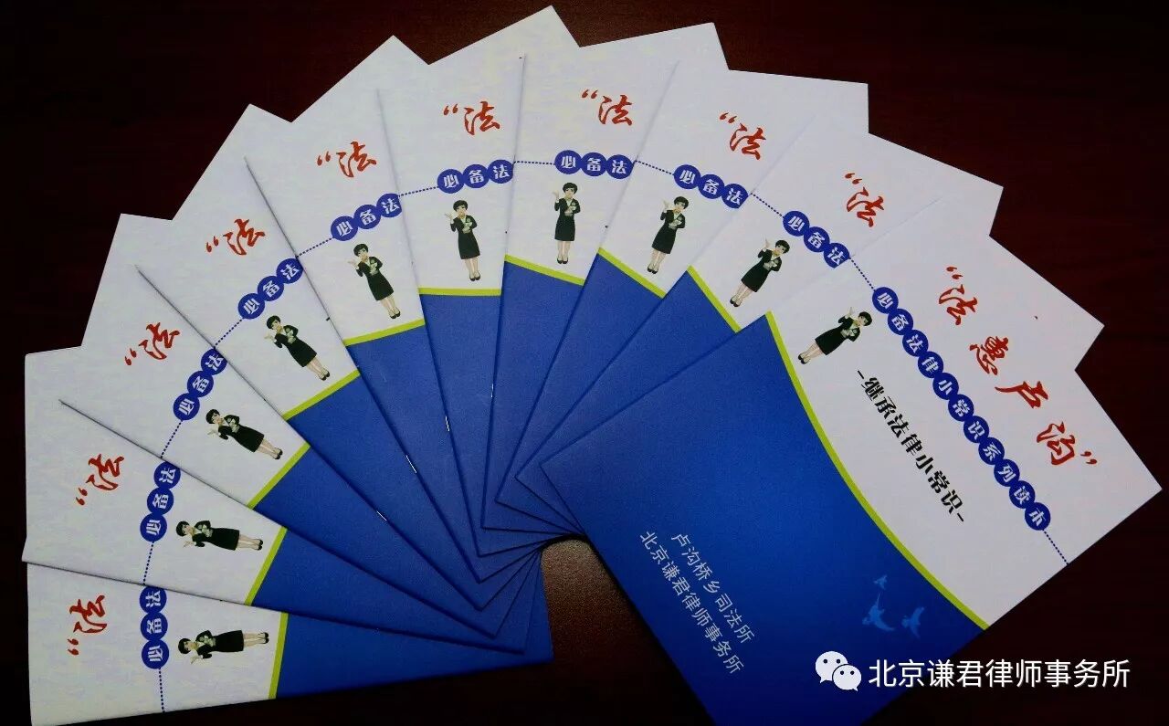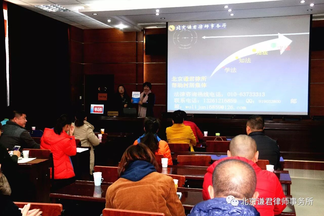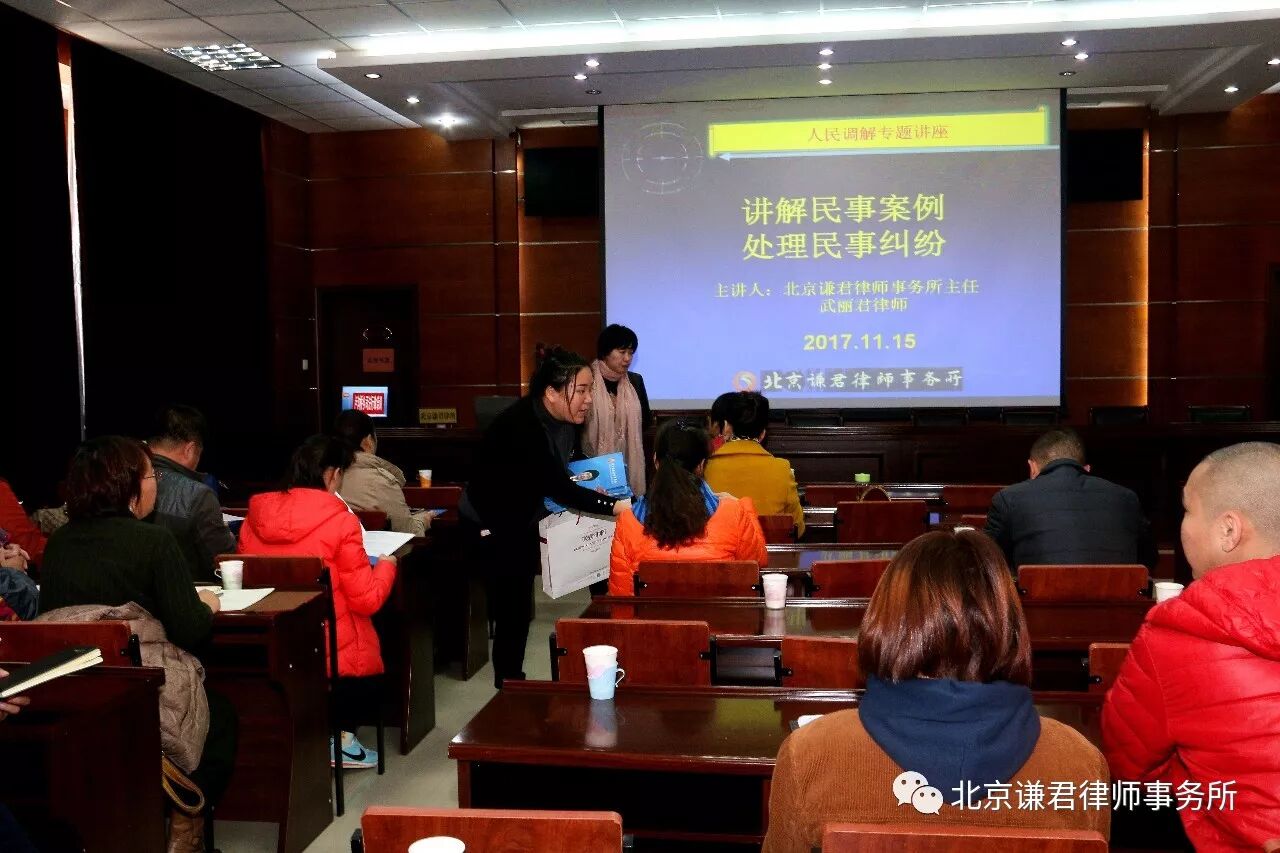 11月15日,北京谦君律师事务所武丽君主任一行受丰台区司法局卢沟桥乡司法所邀请,为卢沟桥乡所辖村居负责人及民调主任进行了以“讲解民事案例,调处民事纠纷”为主题的法律知识培训讲座。卢沟桥司法所副所长张希伟和50余名村居负责人及民调主任参加了活动,谦君律所发放《谦君一法公益行—法律援助篇》、《谦君一法公益行—继承篇》和《“法惠卢沟”必备法律小常识系列读本》等宣传材料200余份。