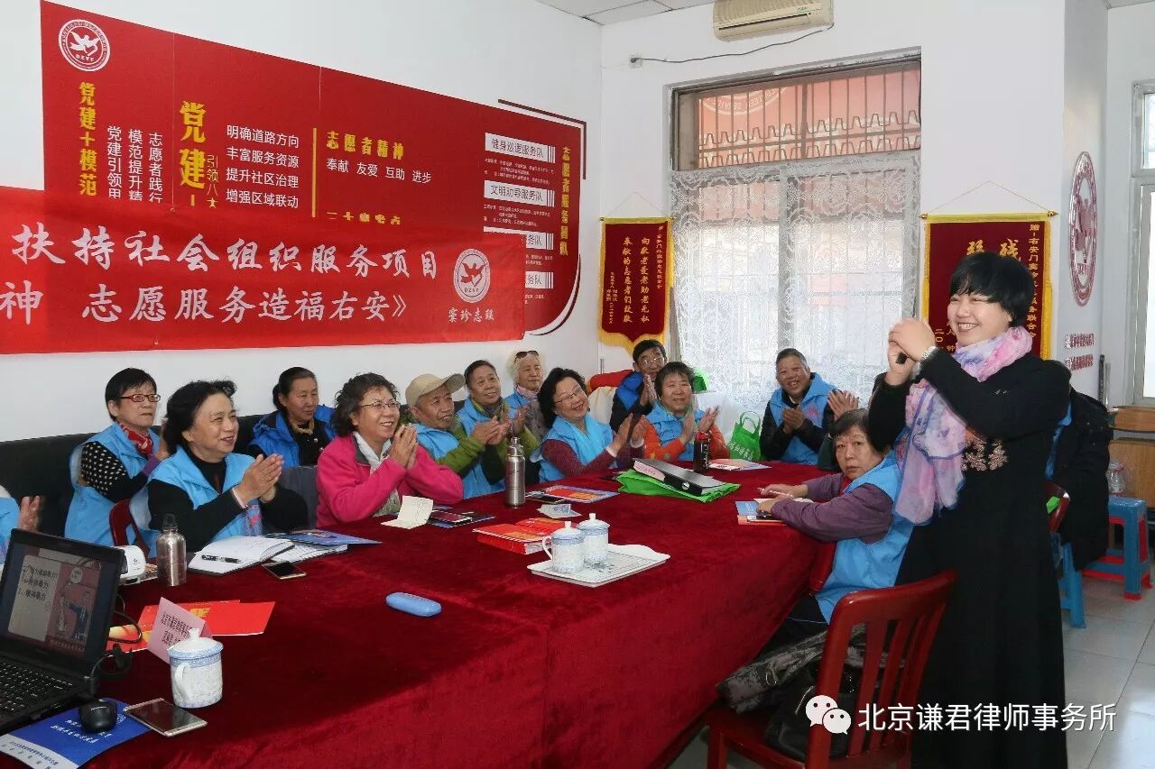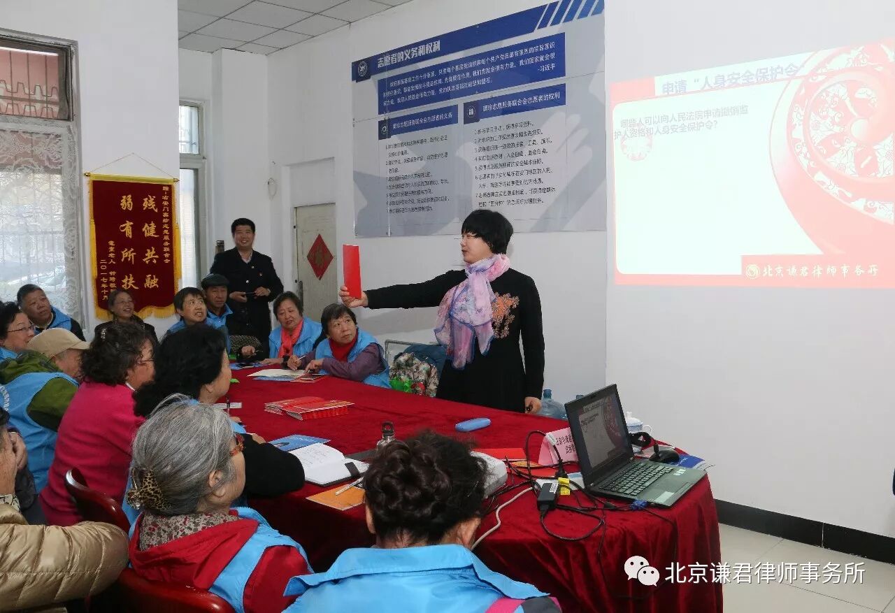 11月24日,北京谦君律师事务所武丽君主任一行应丰台区右安门街道邀请,为丰台区右安门窦珍志愿者服务联合会的志愿者们举行了一场专题法律知识培训;向参加培训的志愿者发放《北京谦君律师事务所宣传册》和《北京谦君律师事务所便民联系卡》近百份,并在培训后接待了志愿者的涉法咨询, 右安门街道司法所刘宏智所长参加了培训。
