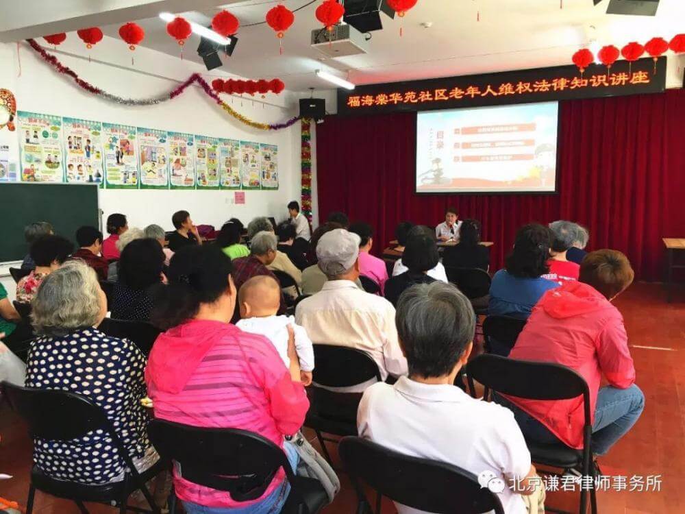 北京谦君律师事务所认真履行社会责任,积极开展法律服务村居行活动,老年人维权法律知识讲座是谦君律所系列讲座的一部分。谦君律所公益普法宣传活动,已经开展到二十余家村居,讲座近百场,受到司法所和村居民的普遍欢迎和一致好评!