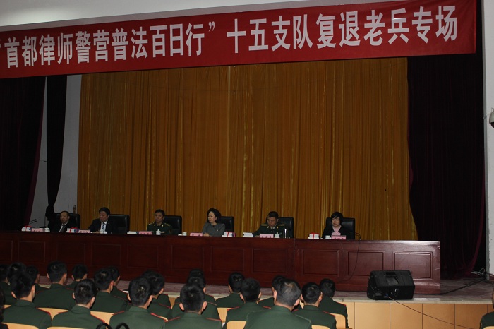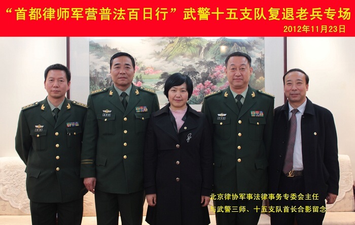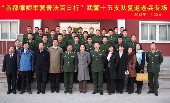 2012年11月23日下午,北京律协军事法律事务专业委员会主任、北京谦君律师事务所主任武丽君组织委员律师,在中国人民武装警察部队北京总队第十五支队举行了“首都律师军营普法百日行”启动仪式暨复退老兵专场。参加活动人员有:武警三师孔繁伟副师长、杜玉忠副师长、武警十五支队杜风军支队长、佘林政委及五百多名复退老兵,北京律协张巍副会长、业教委钱列阳主任、罗占义副主任、张鹏副主任、晏军华秘书长、婚姻家庭专委会孙长刚副主任、劳动和社会保障专委会郝云峰副秘书长、刑法专委会石红英副主任、刑诉法专委会娄秋琴副秘书长等十名律师。