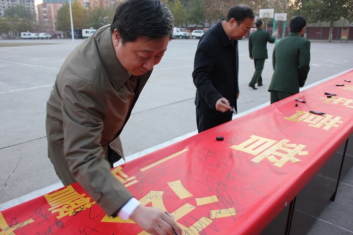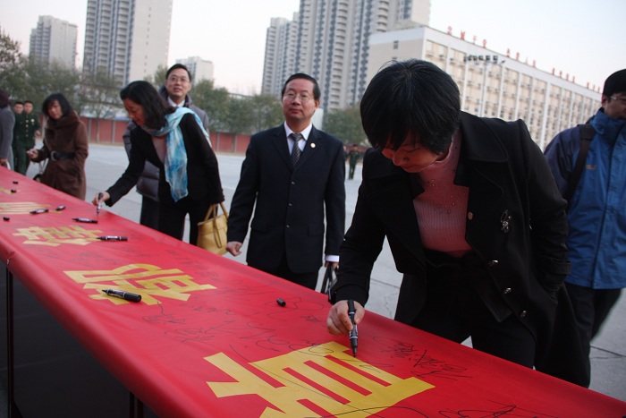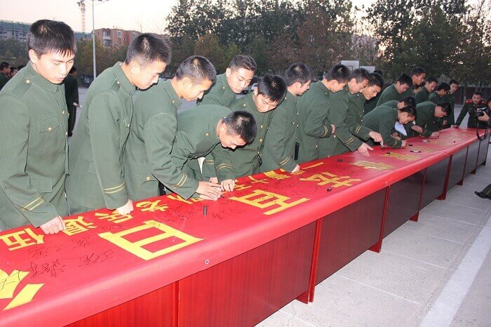 2、北京律师与武警部队首长和退伍老兵五百余人,在观礼台前的“首都律师军营普法百日行”条幅上签名留念;