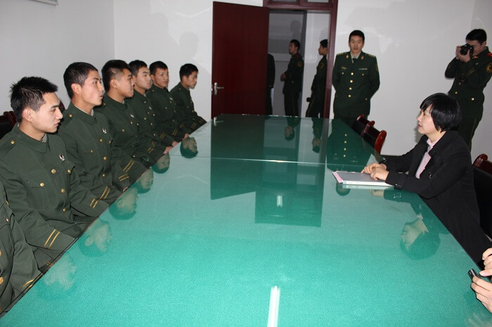 参会律师原定分成三组:家庭涉法组、劳动就业组、民事刑事综合组,分别在武警部队特勤中队三个班里,开展专项法律咨询。由于战士们人数众多,临时另外分出一组,解答战士们的法律困惑。律师们对战士们的问题一一进行耐心、细致地解答,复退老兵们踊跃提问,气氛热烈,活动持续很晚才结束。