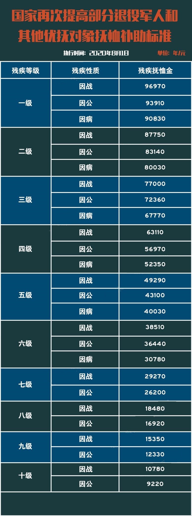 享受标准:评定伤残等级的因战、因公1-10级、因病1-6级的伤残军人,享受国家定期抚恤补助,服役期间由部队发给,退役后的次年,由地方人民政府发给。最新的标准2020年8月1日调整的标准,具体可以参考如下: