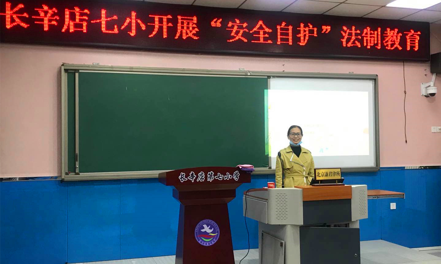 10月21日,秋高气爽、阳光明媚。北京谦君律师事务所朱嫄嫄律师受北京市长辛店司法所邀请,前往丰台区长辛店第七小学,为该校三、四年级200多名学生进行了一场生动有趣的“安全自护,防拐防骗”法律知识讲座。长辛店镇司法所王蕾副所长及该校袁金虎主任参加了此次讲座。