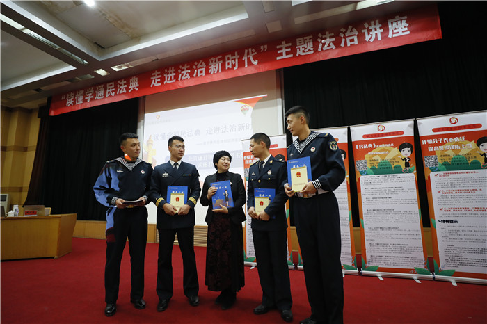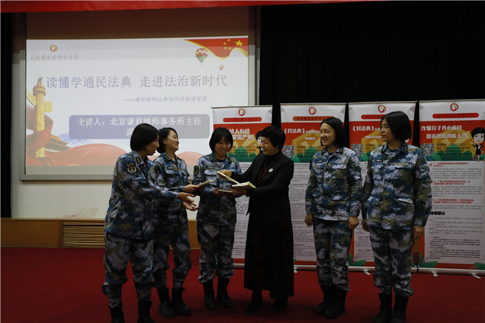 为配合部队进一步学习贯彻《民法典》,武丽君主任向部队官兵赠送了《中华人民共和国民法典》和谦君律所新编写的《法典解说---继承》及《谦君一法》等普法手册,受到了部队官兵的一致好评。