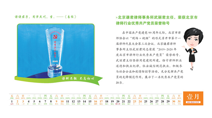 牛年悄然而至,谦君台历精彩呈现!承载着对亲朋好友的殷切问候和新年祝福!记录着谦君律师兢兢业业、敢于担当、极致服务的奔波足迹;诠释着为防疫一线捐赠物资送温暖的拳拳心意,情系国防爱撒官兵送法进军营的拥军情结,深入基层践行社会责任的“最美普法声音”!