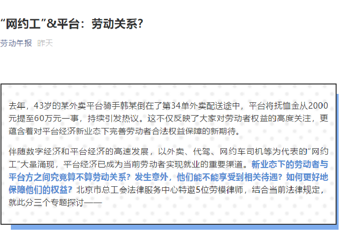 武丽君主任应劳动午报邀请,就“‘网约工’与平台:劳动关系?”热点话题进行研讨,并发表观点!