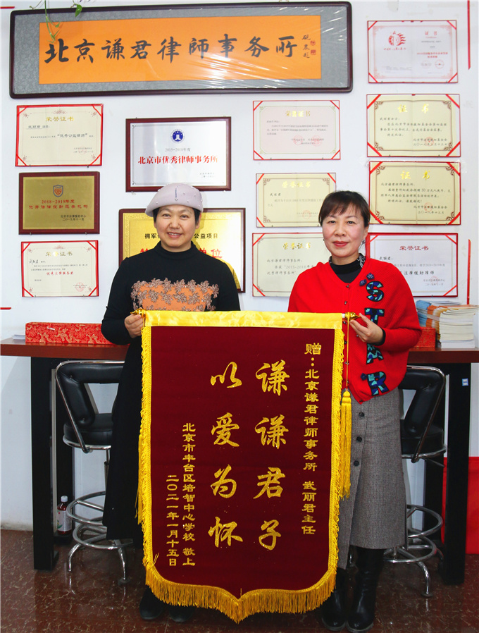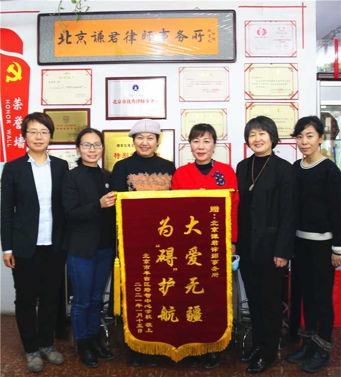 2021年新年伊始,谦君律所收到了新年最好的礼物,三面锦旗!关爱特殊群体的单位对谦君律所特别的爱!一是关注严重智力障碍的培智学校;一是全国优秀干休所朝阳八所。