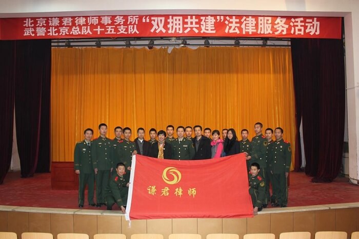 2013年11月24日,北京律协军法委主任、北京谦君律师事务所主任武丽君组织律师到武警某部开展“拥军普法活动”,并与该部队签订《双拥共建法律服务协议》,成为第一家与部队签订双拥共建法律服务协议的律师事务所。北京谦君律师事务所积极响应中央军委号召,开展“法律拥军”活动,长期组织律师为部队公益进行普法宣传。正直老兵退伍之际,武丽君主任在签订协议后,为即将退伍走向社会的老兵提供成家立业方面的法律知识讲座和咨询。今后谦君律师事务所将继续加强与驻京部队的联系和合作,为部队官兵提供法律援助和法律宣传,将双拥共建活动开展的更有声有色。