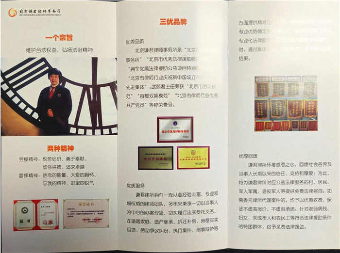 谦君律师遵循一个宗旨“维护当事人合法权益,弘扬法治精神”;发挥两种精神“劳模精神和雷锋精神”,体现三优品牌“优秀品质、优质服务、优厚回馈”;始终牢记四项坚持“坚持严谨科学的流程化办案,确保高质服务;坚持精准务实的专业化操作,确保不留遗憾;坚持雷厉风行的办案原则,确保高效运作;坚持谦虚笃信的人性化服务,确保满意度。”,发挥专业挺长,承担社会责任,为村居和部队开展公益送法活动,弘扬法治精神,“两会”助力,为依法治国营造祥和的法治环境贡献力量!