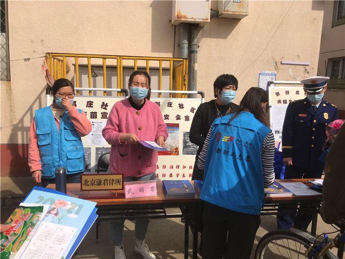 3月23日,谦君律所武丽君主任带领律师团队前往长辛店街道张郭庄和张家坟两个社区,为居住在拆迁周转房区域的居民们开展了以《强化消防安全意识 确保社区祥和平安》为主题的法治宣传活动。张郭庄社区书记武明霞、副书记蒲菁、民调主任刘莉和张家坟社区安全主任来红玉、民调主任付宇等领导参加了此次消防安全法治宣传,北京消防救援总队北大地救援站付邦龙指导员应邀参加了此次消防安全宣传活动。
