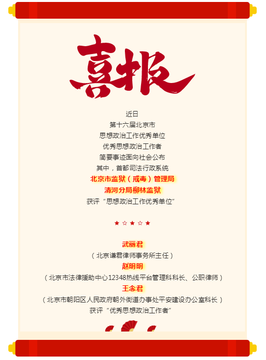 热烈祝贺谦君律所武丽君主任被评选为“第十六届北京市优秀思想政治工作者”!北京市司法系统1个单位、3名个人获此殊荣