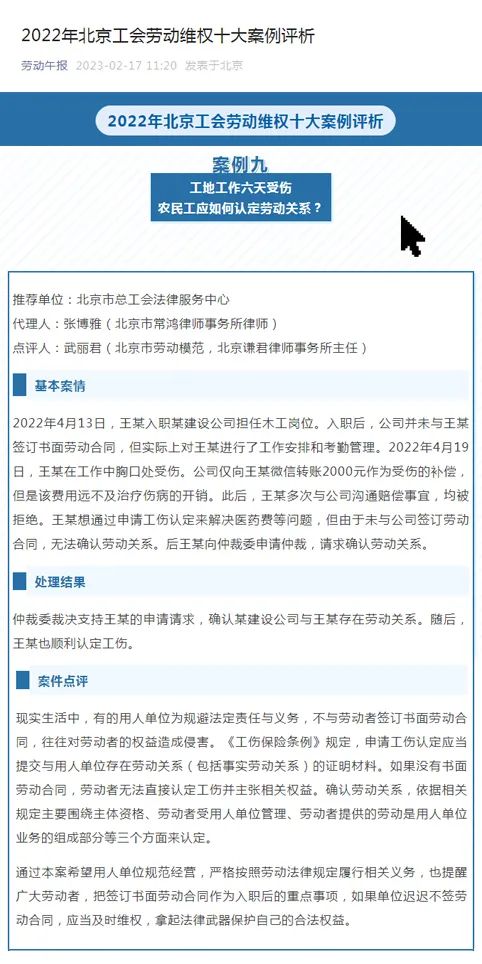 近日,由北京市总工会权益工作部、北京市总工会法律服务中心与劳动午报社共同评选出“2022年北京工会劳动维权十大案例”,市总工会法律服务中心劳模法律服务团的劳模律师、北京谦君律所武丽君主任应邀对案例九“工地工作六天受伤农民工应如何认定劳动关系”进行简要评析。