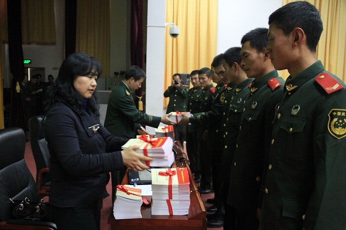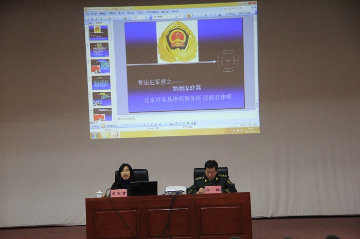 2012年11月21日上午,北京市律协军事法律事务专业委员会、北京谦君律师事务所武丽君主在武警某部,为退伍老兵6百余人,开展法律知识讲座。退伍老兵基本都是高中毕业就应征入伍,对法律知识了解较少,法律意识淡薄,部队相对比较封闭,战士们了解学习法律知识的渠道较窄,战士们很需要补上法律这堂课。即将走向社会的退伍老兵,面临成家立业,通过武律师的讲座,为退伍老兵就业和创业及成家可能遇到的法律问题,结合形象生动的案例进行讲解,深受官兵欢迎,部队政委表示希望以后多开展类似普法讲座。讲座结束,武丽君主任又向退伍老兵赠送武律师参与编写的法律书籍。